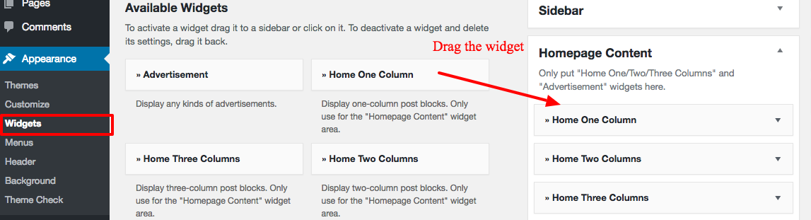 Put the "Home 2/3/4 Columns", "Home Carousel" and "Home Top Section" widgets to the Homepage widget area.